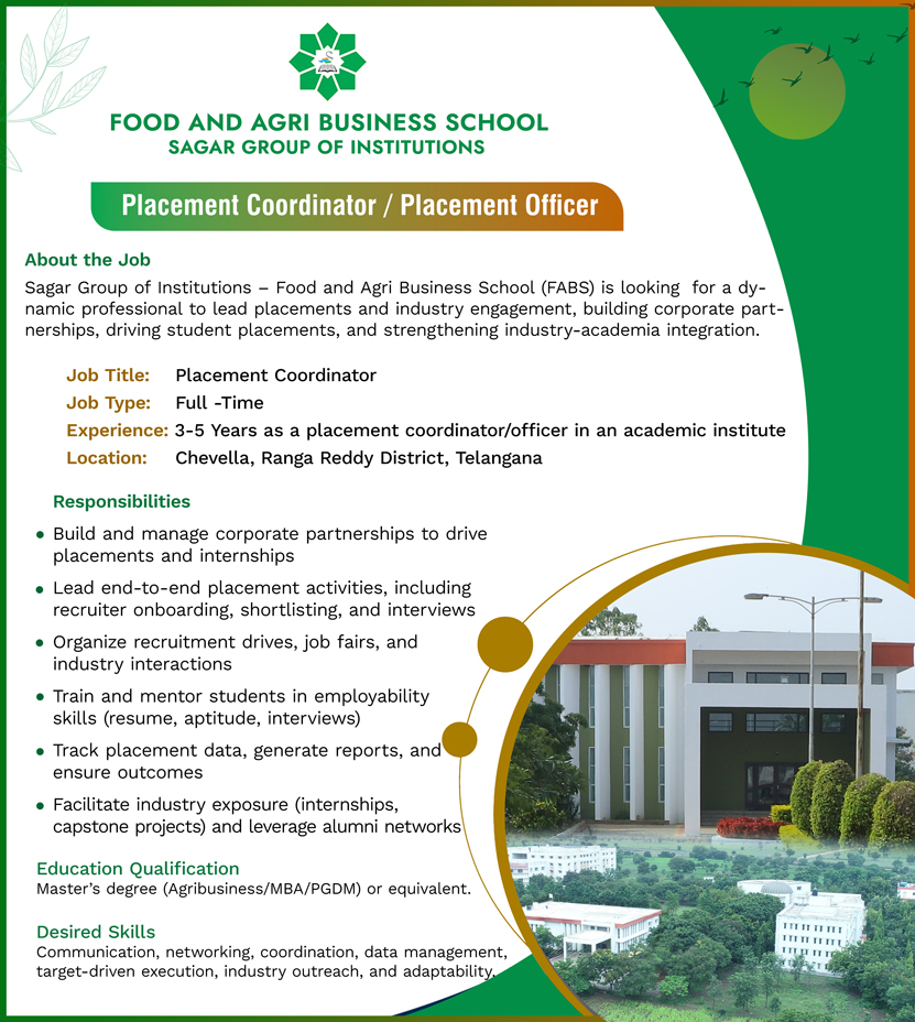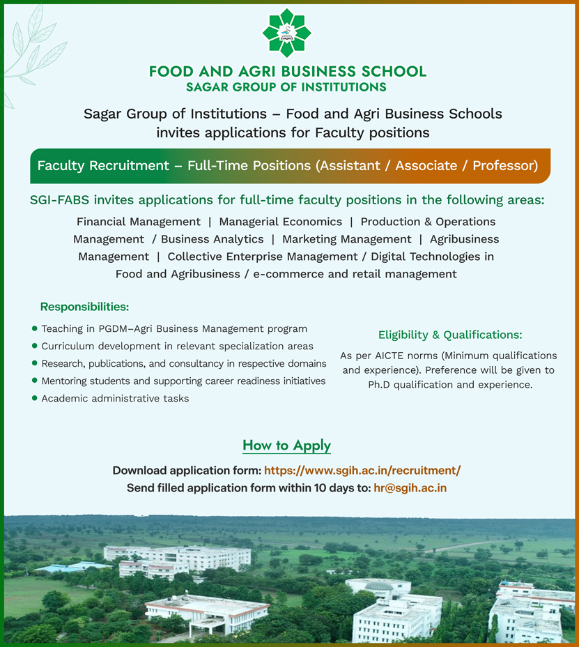 Short listed candidates will be invited to deliver Faculty Recruitment Seminar on any topic of their choice related to Farm, Food and Agri Business Enterprises Management (about 70 minutes including question-answers for a minimum of 20 minutes)